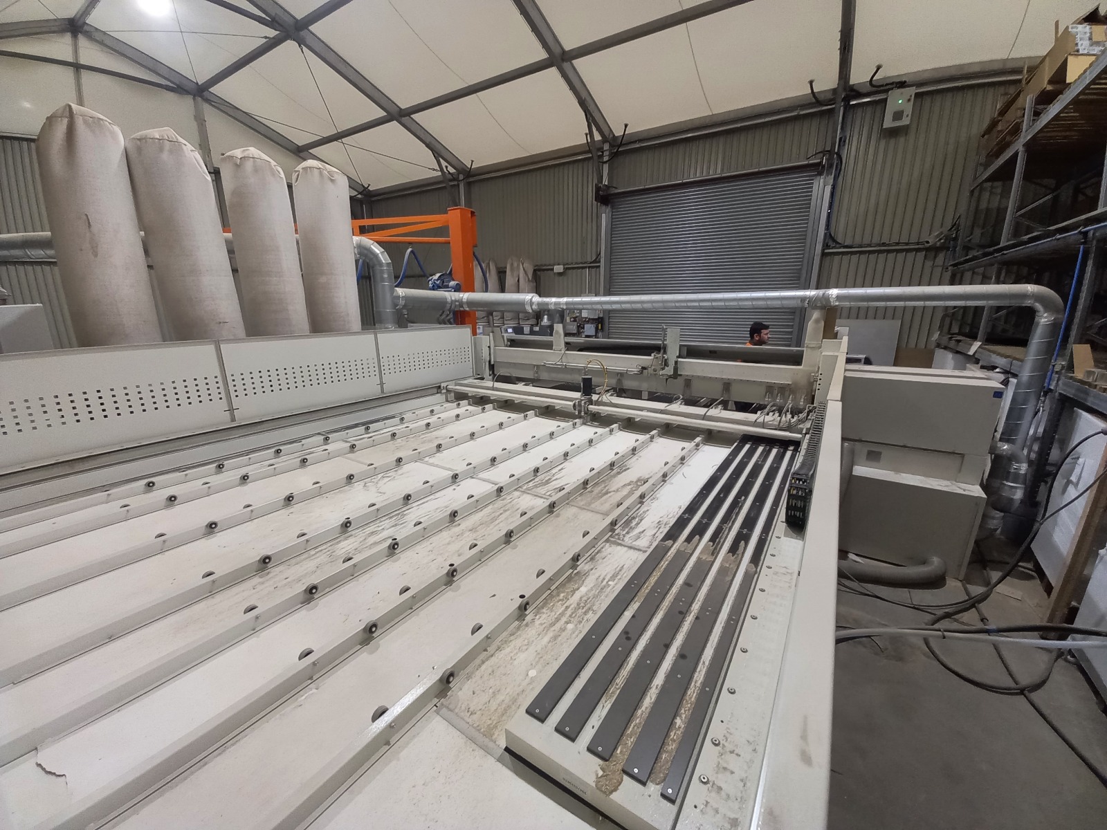 Single-blade beam saw controlled by PC/PLC control system, designed to cut solid wood panels or panel stacks and its products (chipboards, MDF panels, multilayer panels, plywood panels and fiber panels). The solution to integrate the beam saw inside a flexstore storage.